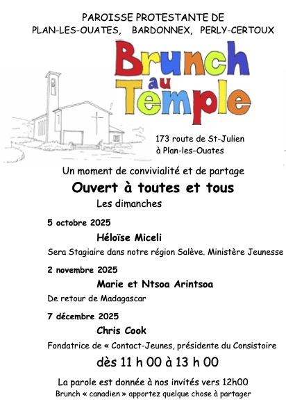 Nous nous retrouvons dès 11h pour partager le brunch ensemble. Notre invité-e du jour nous explique son parcours de vie à partir de 12h, ce qui laisse le temps d’arriver aux participants qui auraient suivis un culte ailleurs avant.